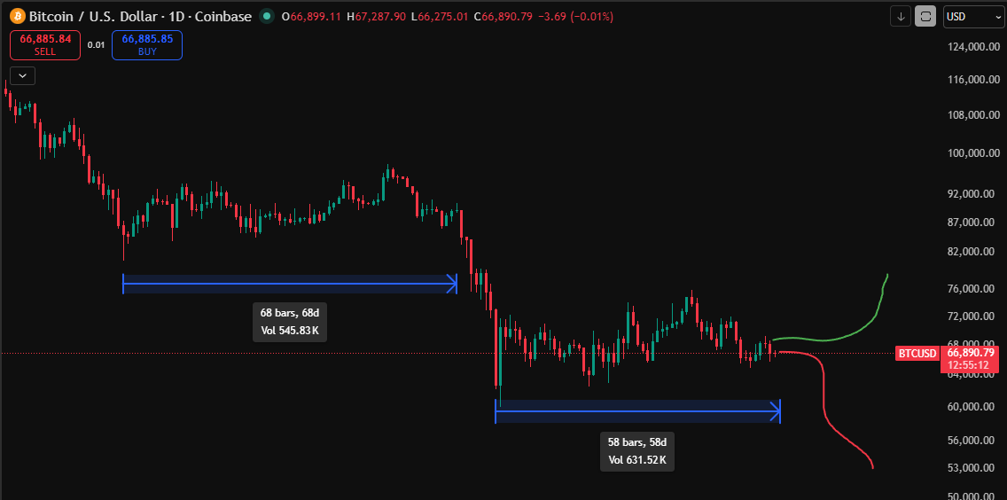 The current range has lasted nearly 60 days. For context, the last major consolidation phase stretched to around 68 days before ultimately breaking down into a sharp decline.