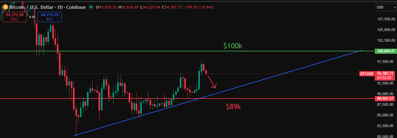 Bitcoin hit resistance near $98k and has since cooled off, hovering around the $95k area. This short-term pause isn’t a surprise after such a strong move.
