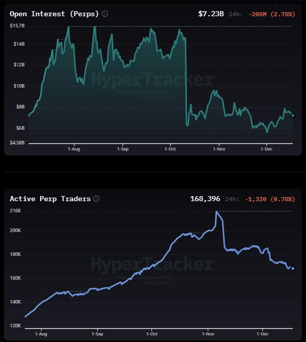 From a statistical perspective, crypto open interest remains significantly lower and has yet to recover from the major October crash. At the same time, active perpetual traders continue to decline, suggesting that many participants are either taking a break, exiting the market, or reallocating capital elsewhere.