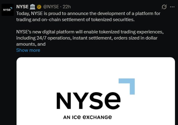 The New York Stock Exchange is building a system where regular stocks and ETFs can exist as digital tokens. You would still own normal shares with the same rights, but the underlying tech would use blockchain to move money and settle trades.