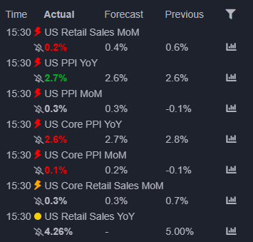 Today’s PPI and consumer data have shifted sentiment again. Retail sales were softer and core PPI cooled which indicates that demand is easing and underlying inflation continues to slow. Headline PPI was a bit hot but not enough to disrupt the trend. Overall this leans slightly positive for risk assets since it improves the outlook for future rate cuts.