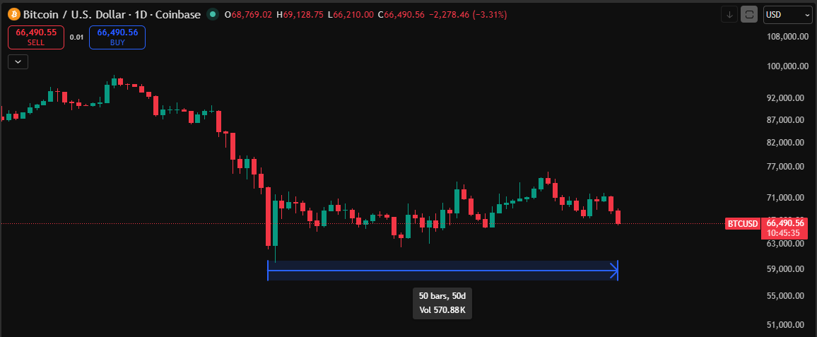 Bitcoin has now spent around 50 days ranging. Compression like this doesn’t last forever, and unless something shifts soon, a move toward the $60K level is still the most likely scenario.
