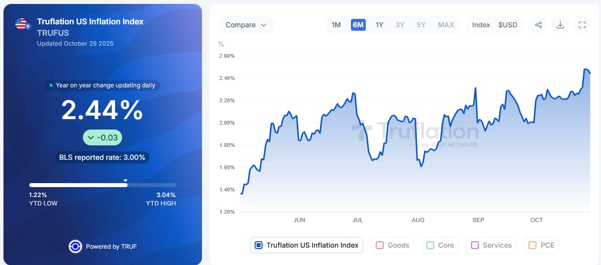 Truflation is a real-time inflation index that scrapes millions of online prices to track how costs are changing day to day. Unlike government CPI data, it updates continuously and reflects what consumers are actually paying.